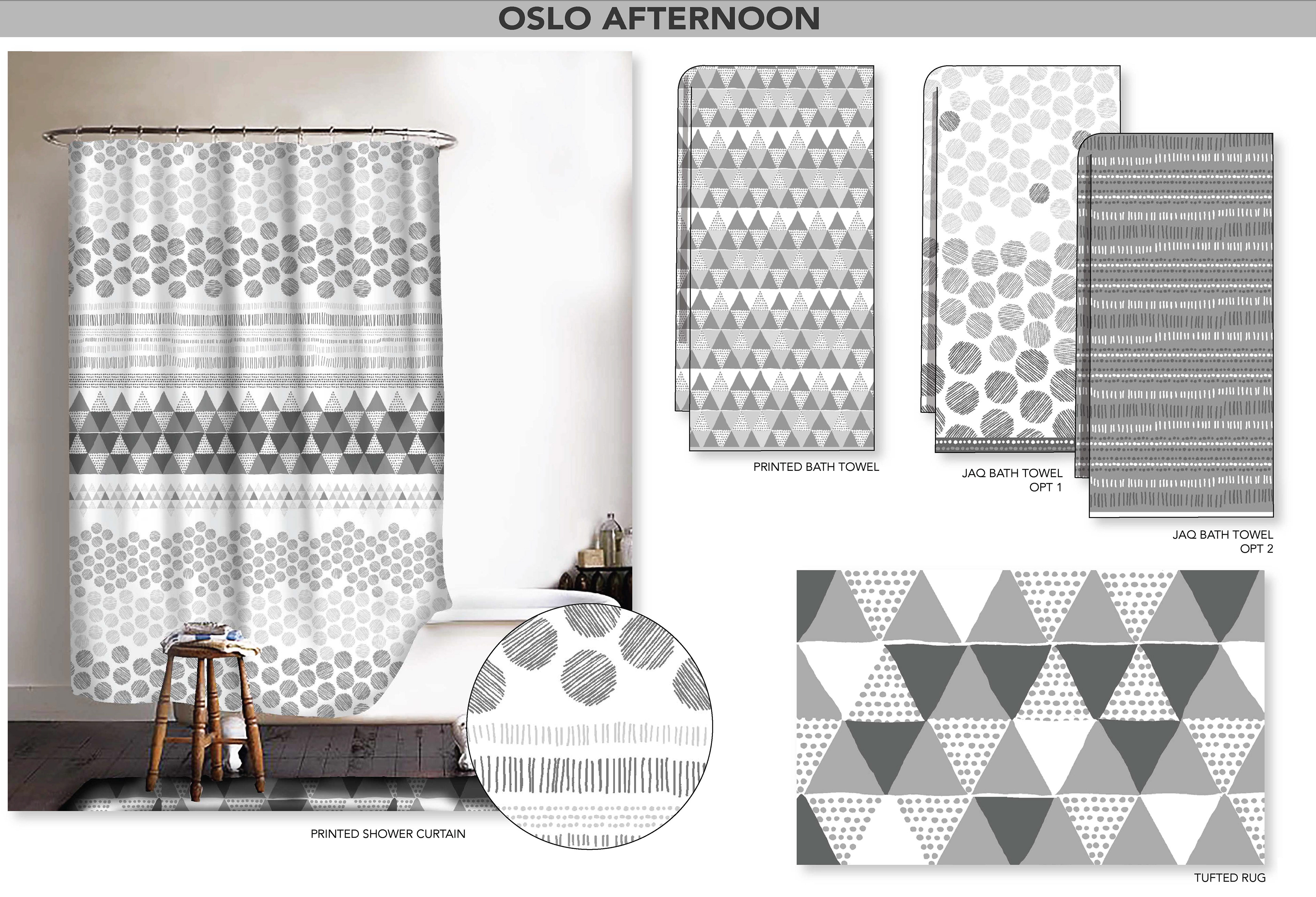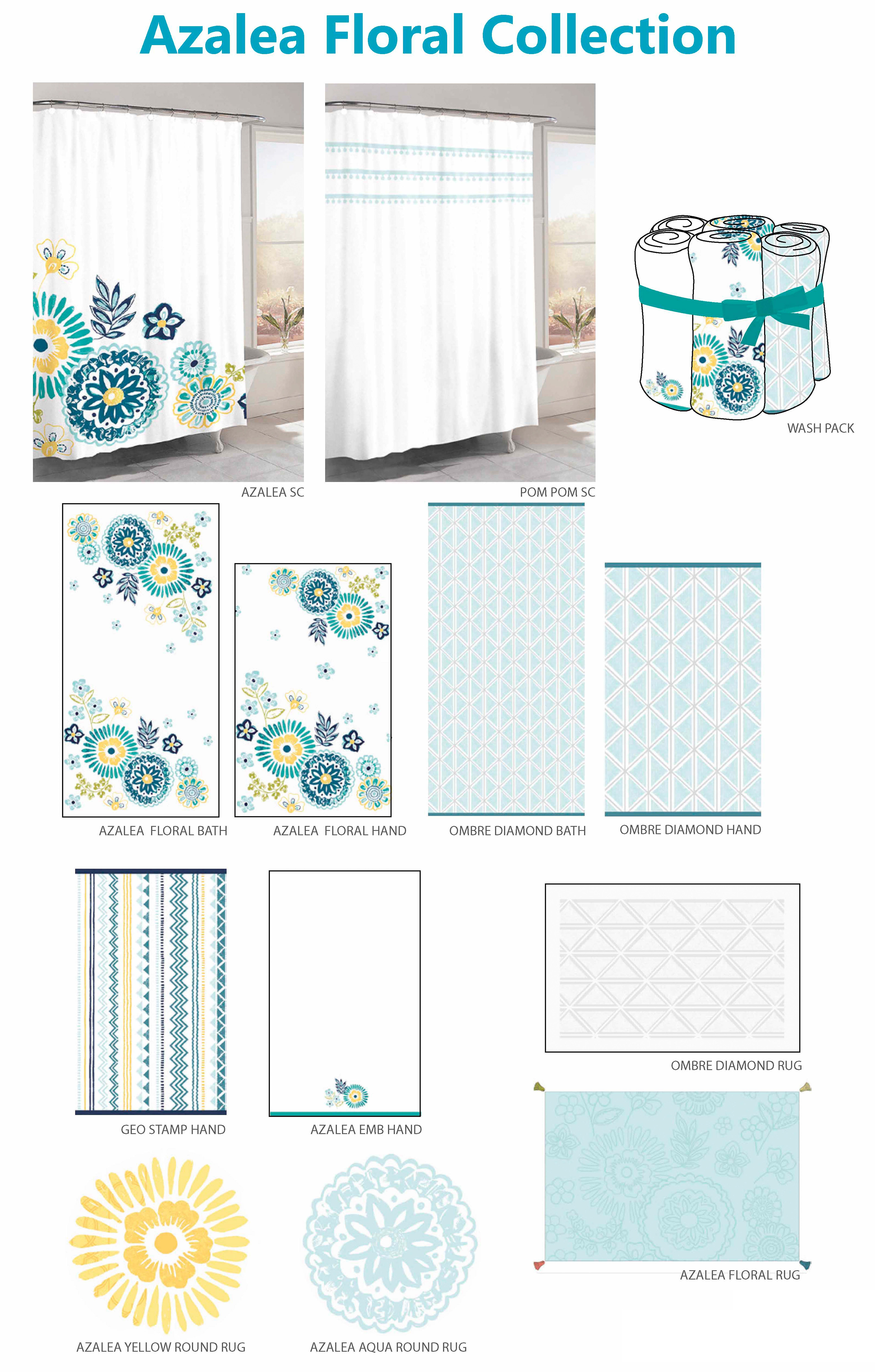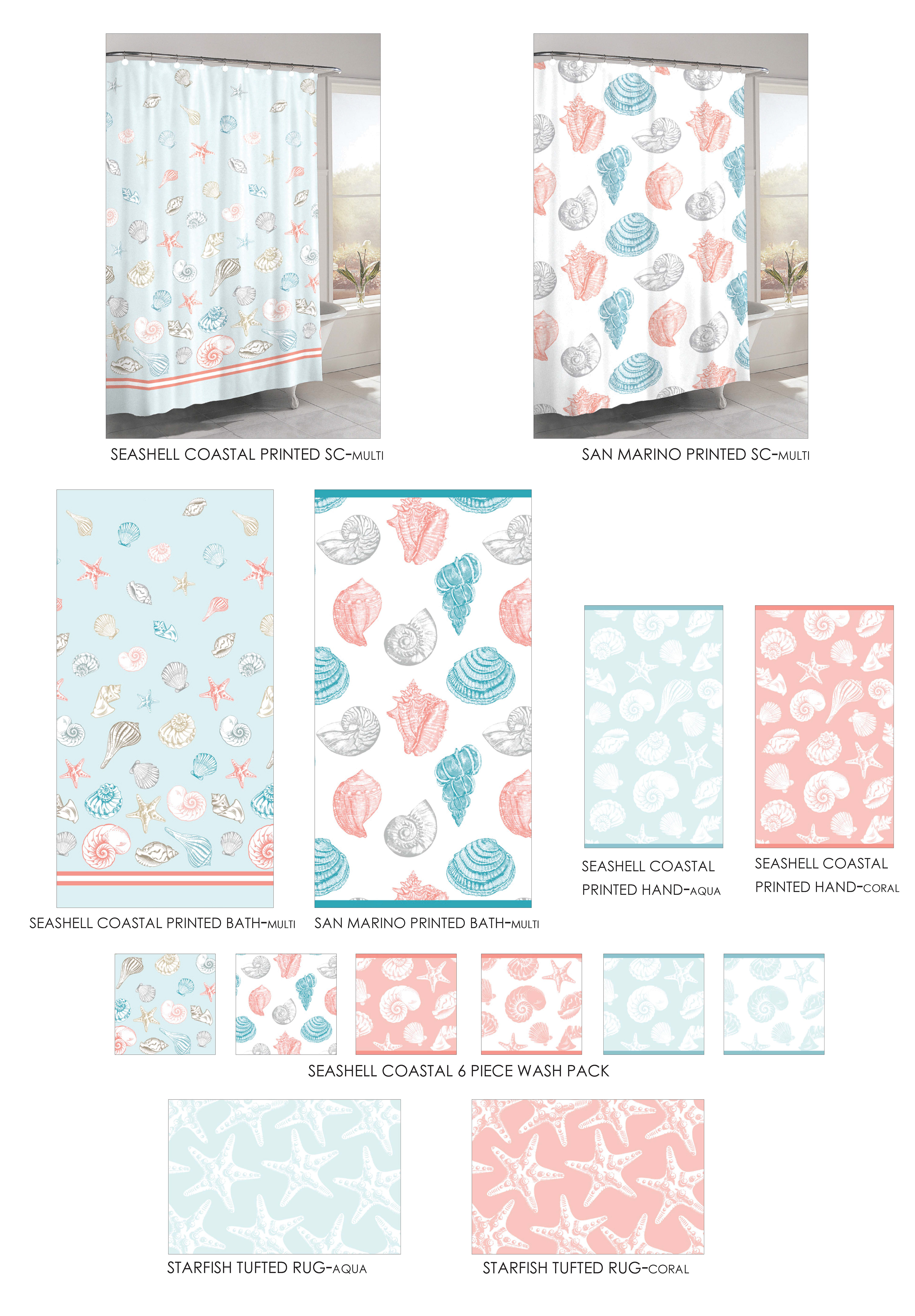 Designs for the mass market. Collections of shower curtains, towels, and bath rugs; all merchandised together.